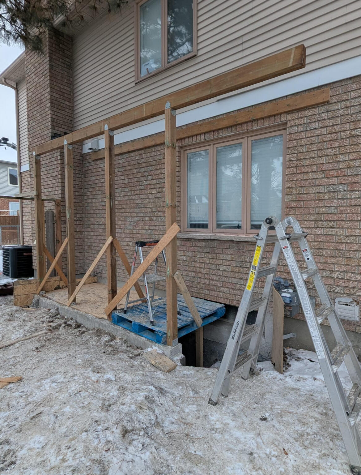Built and poured concrete steps for the new entrance, ensuring proper slope, height, and safe surface finish.Wood Canopy & Roofing